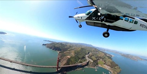 | L'avion de Xwing, équipé de technologies d'autonomie, survole le Golden Gate Bridge à San Francisco. |