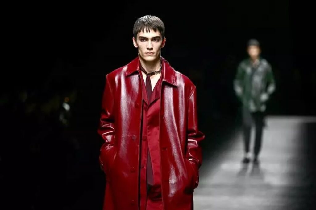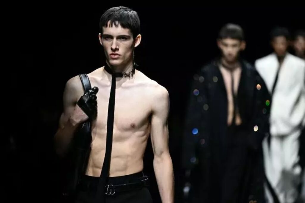 Des cravates ultra-longues frôlant la cuisse sont portées, tels des foulards, sur des costumes croisés cintrés ou amples, voire sur un torse nu pour les plus téméraires, un choix osé pour une collection conçue pour l'automne-hiver 2024/25.