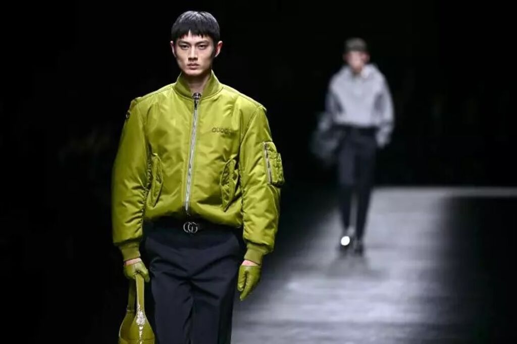 Tout comme sa première collection femme pour Gucci, présentée en septembre, celle consacrée aux hommes est intitulée "Ancora" ("Encore"), du nom d'un vieux tube de la star italienne Mina.