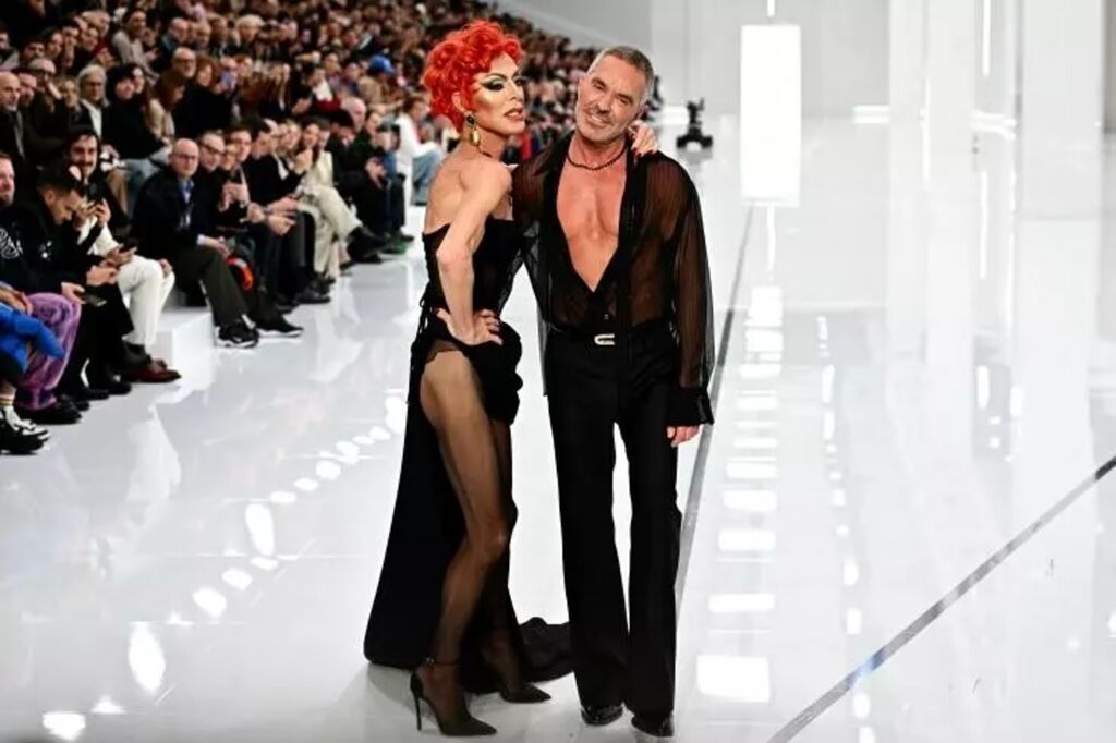 À la fin du spectacle, l'un des frères Caten, Dan, défile en chemise transparente et l'autre, Dean, en version drag-queen, en robe de soirée noire, paré d'une perruque rouge.