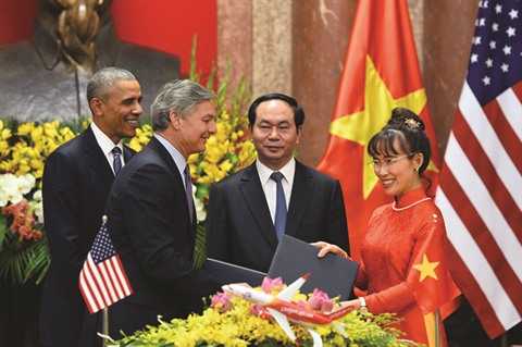| La cérémonie de signature du contrat d’acquisition d’avions entre Vietjet Air et Boeing, en présence du président Trân Dai Quang (de face) et de l’ex-président américain Barack Obama (gauche) en mai dernier. |