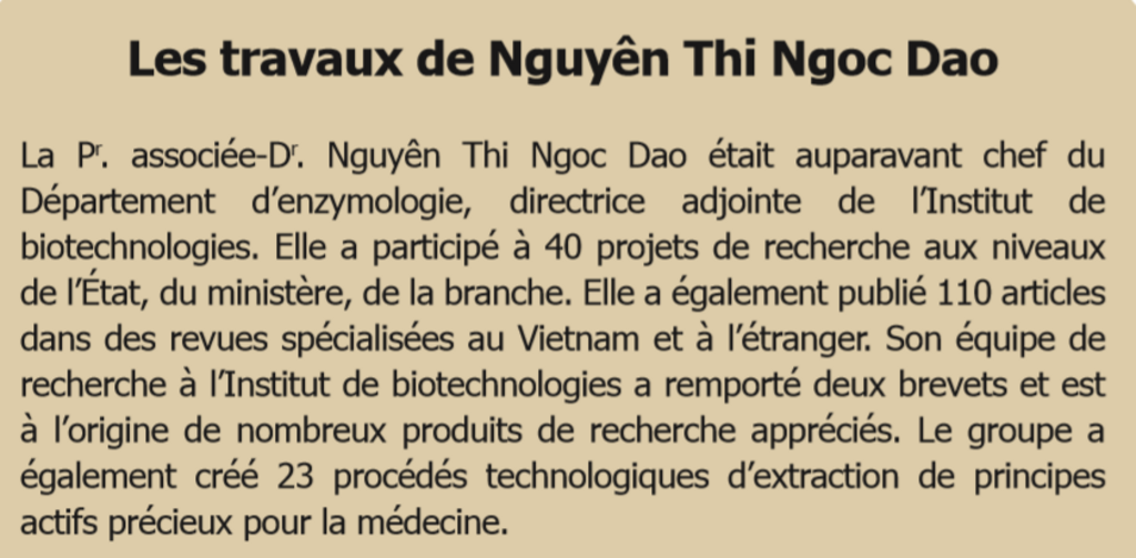 En octobre 1980, le Comité national chargé d’enquête sur les conséquences de la guerre chimique américaine au Vietnam se crée. Mme Dao, revenue d’Allemange avec son doctorat en technologies biologiques, le rejoint avec pour objectif de fabriquer des médicaments afin de détoxifier les victimes du défoliant.