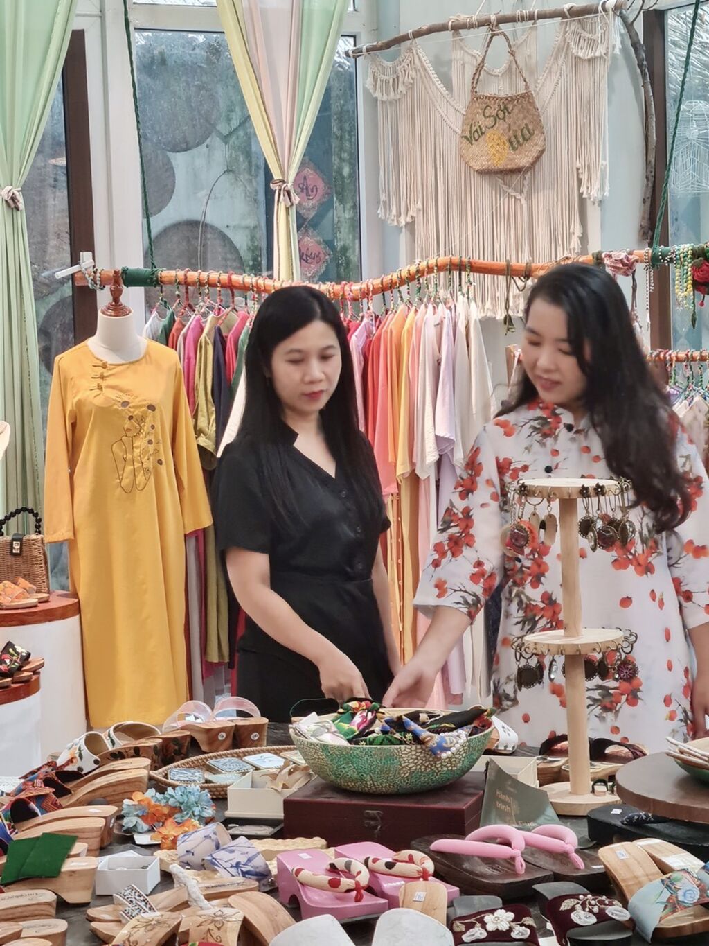 | La styliste Lily Hoàng (droite) et la clientèle Trân Thi Vân Khanh dans l’espace AmCàKê à Hanoï. Photo : Quê Anh/CVN |
