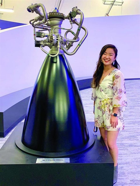 | Carolyn Nguyên à côté de la maquette du moteur BE-7 qu’elle a aidé à construire. |