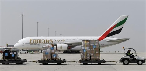 | Matériel médical et des kits de dépistage du nouveau coronavirus transportés devant un Airbus d'Emirates Airlines à l'aéroport international de Dubaï |