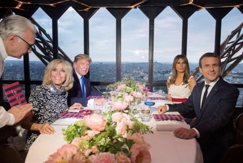 Les couples présidentiels français et américain à la table du chef français Alain Ducasse (gauche), le 13 juillet au restaurant Le Jules Verne à Paris. Photo : AFP/VNA/CVN |