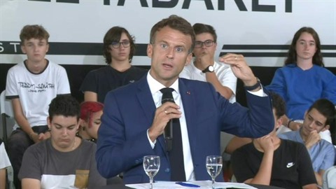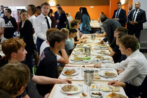 | Le président Emmanuel Macron déjeune avec les élèves du lycée profesionnel Eric Tabarly, le 13 septembre aux Sables-d'Olonne, en Vendée. |