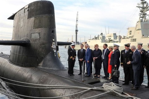 | Emmanuel Macron et Malcolm Turnbull sur le pont d'un sous-marin de la Royal Australian Navy, à Sydney le 2 mai. |