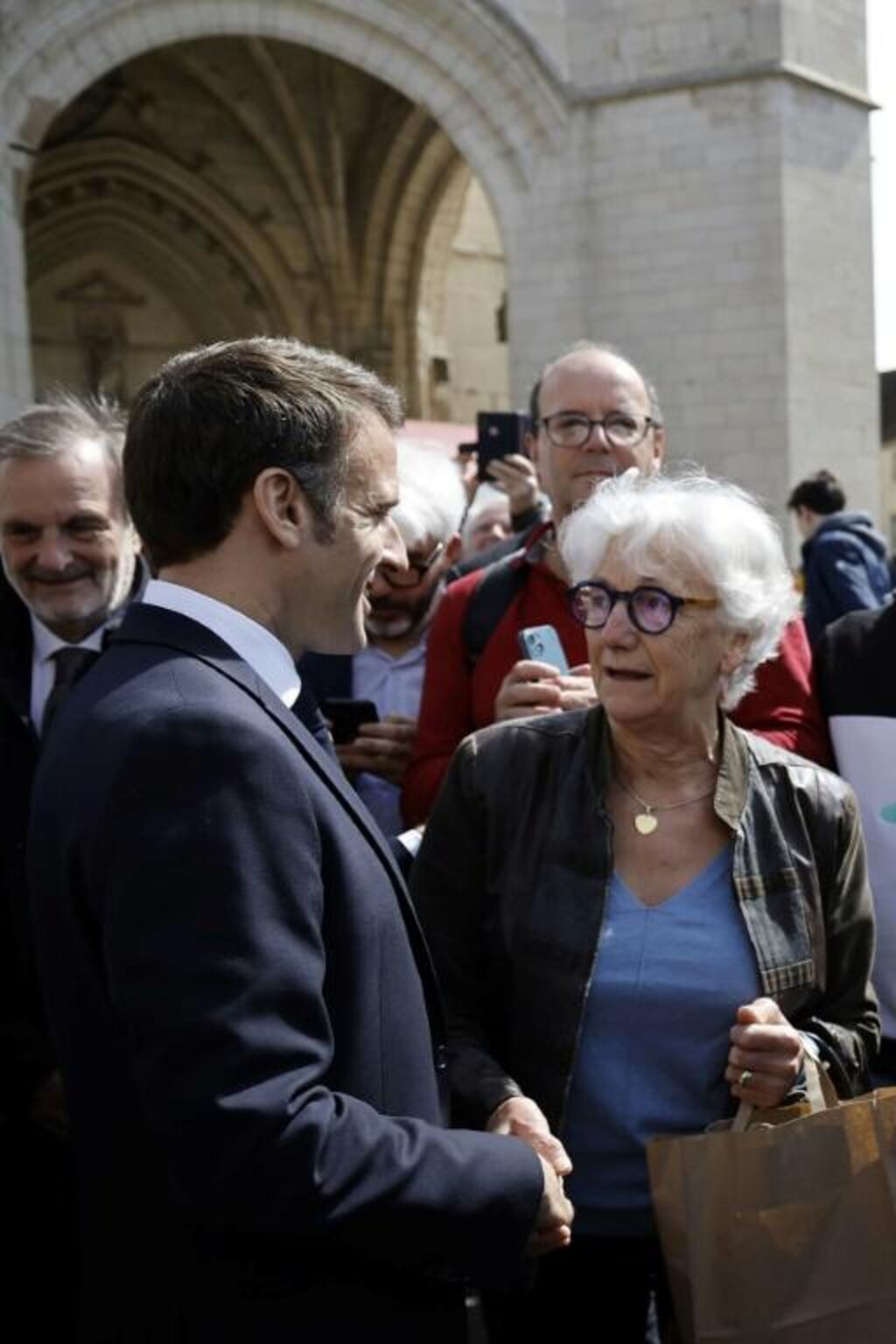 | Le président français Emmanuel Macron (centre) à la rencontre des habitants sur un marché de Dole, le 27 avril 2023 dans le Jura. |