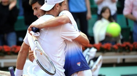 | Le Serbe Novak Djokovic salue son vainqueur autrichien Jürgen Melzer après sa défaite en quart de finale de Roland-Garros 2010 à Paris. |