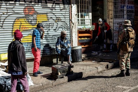 | Un soldat sud-africain dans une rue de Hillbrow, à Johannesburg, où il tente de faire respecter les consignes de sécurité face à la propagation du coronavirus, le 1er mai. |