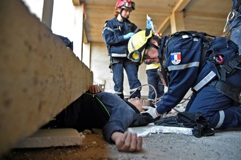 | Un secouriste français prend en charge une victime dans le cadre d'un exercice de simulation de séisme à Bouira en Algérie, le 17 avril. |