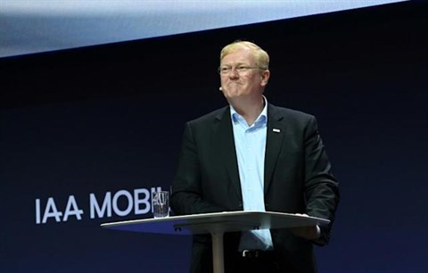 | Stefan Hartung, le Pdg de l'équipementier automobile Bosch, lors d'une conférence de presse au Salon automobile de Munich, le 7 septembre 2021. |