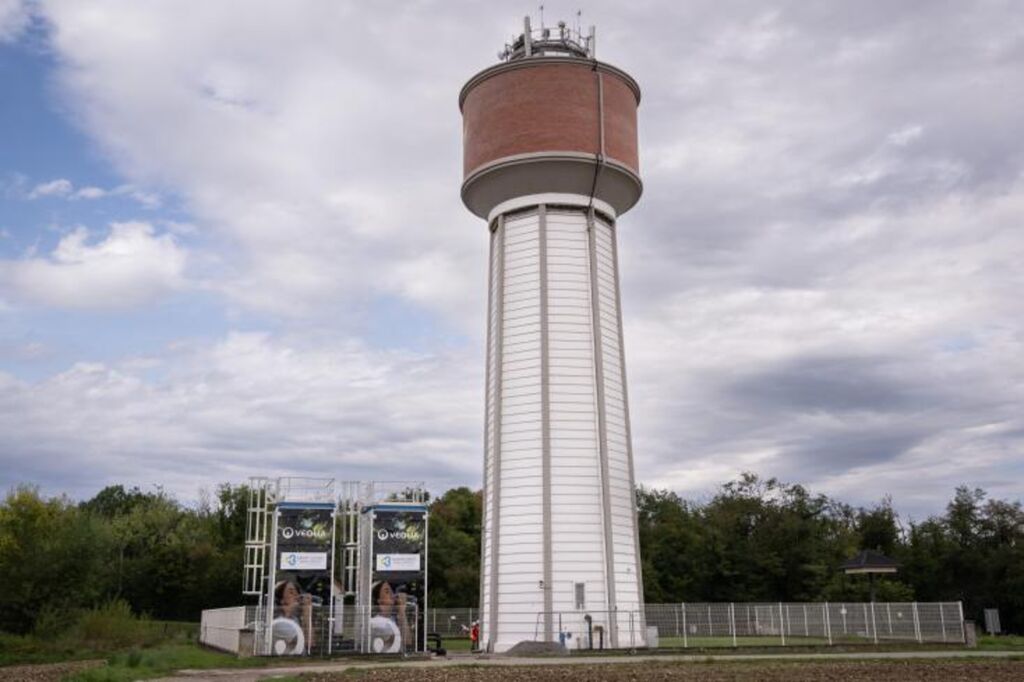 | Le château d'eau de Bartenheim avec une unité mobile de traitement de la pollution de l'eau par les PFAS, le 4 septembre dans le Haut-Rhin. |