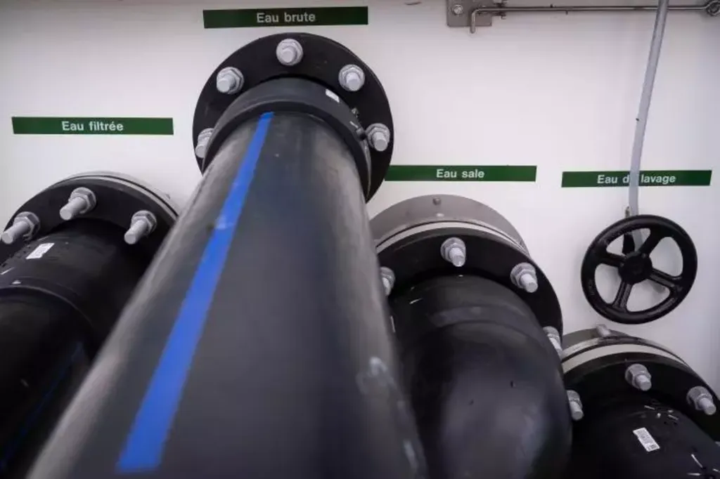 | Des conduites d'eau pour l'eau filtrée, l'eau brute, l'eau sale et l'eau de nettoyage sortent d'une unité mobile de traitement de la pollution de l'eau par les PFAS à Bartenheim, le 4 septembre dans le Haut-Rhin. |