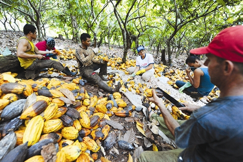 | Des ouvriers arrachent des grains des cabosses près de la commune de Medicilandia dans l’État du Para (Nord du Brésil). |