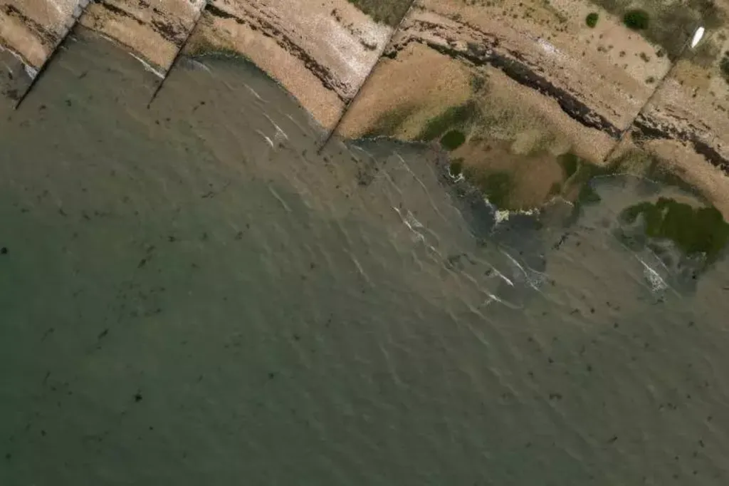 | Vue aérienne d'une zone côtière dans laquelle une canalisation d'évacuation des eaux usées active à été signalée, à Whitstable, le 23 juillet dans le sud-est de l'Angleterre. |