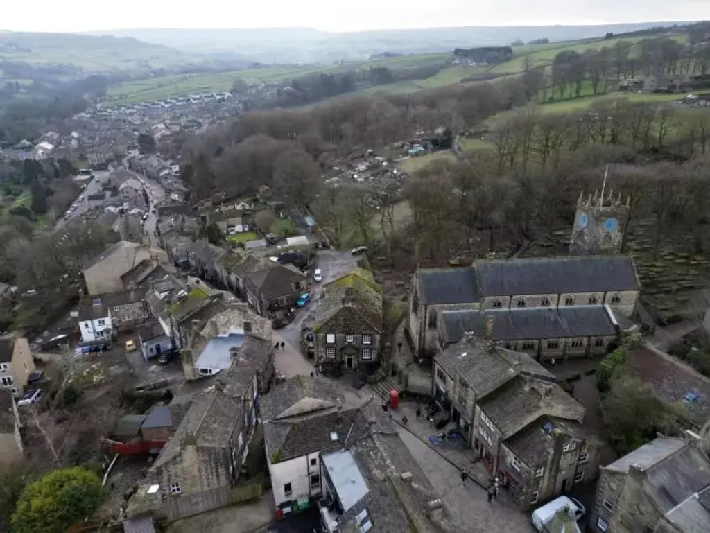 | Vue aérienne du village de Haworth, dans le Nord de l'Angleterre, où a vécu l'écrivaine Emily Brontë. |