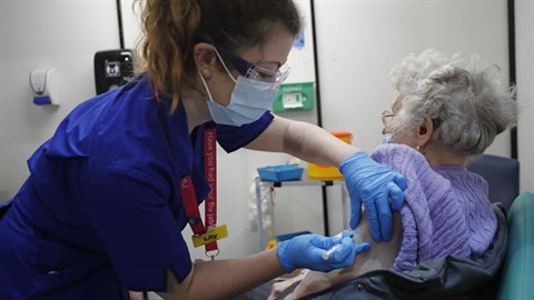 | Une Britannique reçoit une dose du vaccin des laboratoires Pfizer/BioNTech au Guy's Hospital de Londres. |