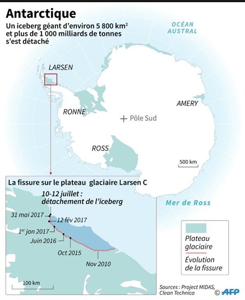 | Carte de l'Antarctique, localisant l'iceberg qui s'est détaché du plateau glaciaire Larsen C. |