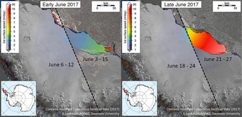 Larsen C était fissuré depuis des années par une gigantesque crevasse, qui s'est allongée de manière frappante ces derniers mois, gagnant jusqu'à 18 km en décembre. Début juillet, le futur iceberg n'était plus relié au continent que sur cinq kilomètres.