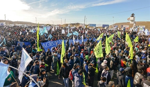 | Des employés du pétrole manifestent à Comodoro Rivadavia, en Argentine, le 6 mai pour dénoncer les licenciements et la rigueur économique appliquée par le nouveau gouvernement de centre-droit. |
