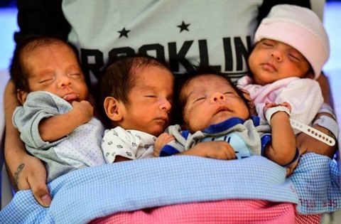 | Les quadruplés Adriel, Jeziel, Ulises et Zoe avec leur mère Adriana Beramendi, à la maternité Ramon Sarda de Buenos Aires, le 7 juillet. |