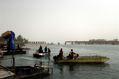 | Des Syriens empruntent le fleuve de l'Euphrate le 15 octobre pour se rendre à Raqa ou sortir de cette ville du nord syrien, avec en arrière plan l'un des ponts détruits pendant l'offensive qui a délogé il y a un an les jihadistes de la cité. |