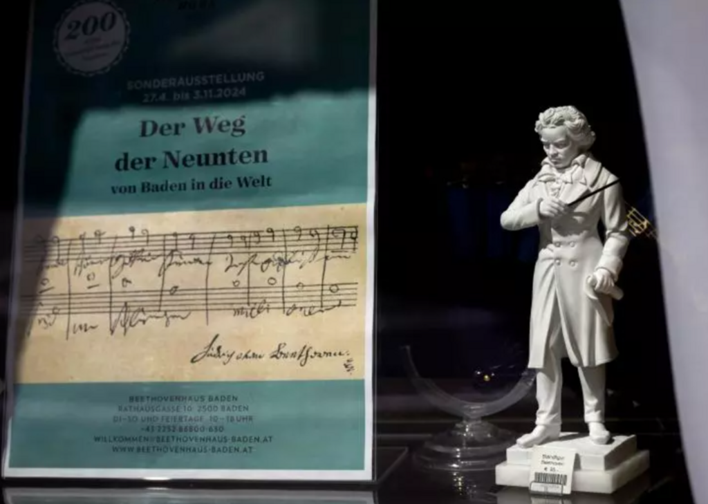 | Une figurine du compositeur allemand Ludwig van Beethoven et une partition de la symphonie N°9 sont exposées dans le musée qui lui est consacré à Baden près de Vienne, en Autriche, le 30 avril. |