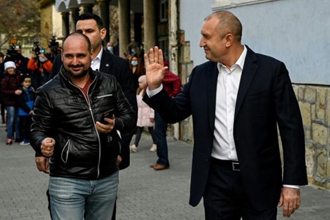 | Le président bulgare sortant et réélu Roumen Radev (à droite) salue des partisans après avoir voté au second tour de l'élection présidentielle, à Sofia le 2 novembre. |