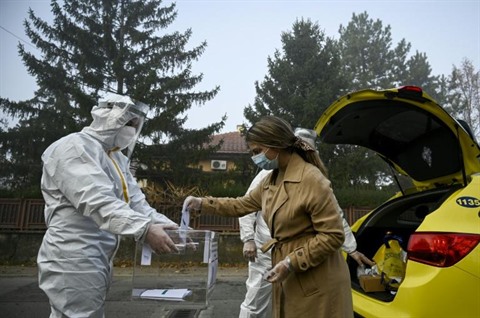 | Un assesseur d'un bureau de vote mobile, revêtu d'une combinaison de protection contre le coronavirus, recueille le vote au second tour de la présidentielle d'une femme dans le village de Voluek (Bulgarie), le 2 novembre. |