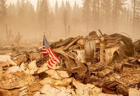 | Un drapeau américain a été planté sur un campion de pompiers incendié à Greenville, dévastée par le gigantesque incendie, le 7 août. |
