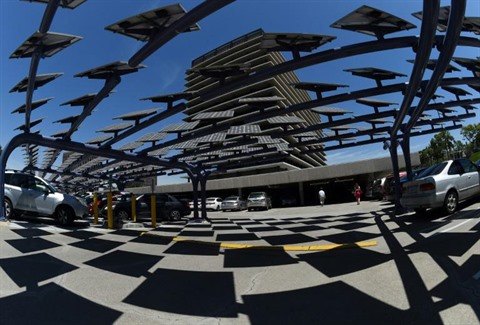 | Parking de Los Angeles couvert de panneaux solaires qui génèrent de l'électricité pour des bureaux en face. |