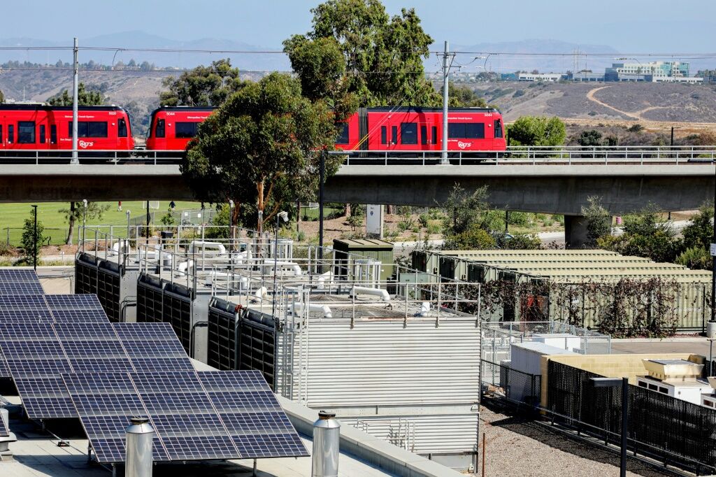 | Des conteneurs de stockage d'énergie et des panneaux solaires à l'univesité de San Diego en Californie. |