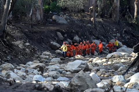 | Des équipes de secours recherchent des victimes d'une coulée de boue à Montecito, le 10 janvier en Californie. |