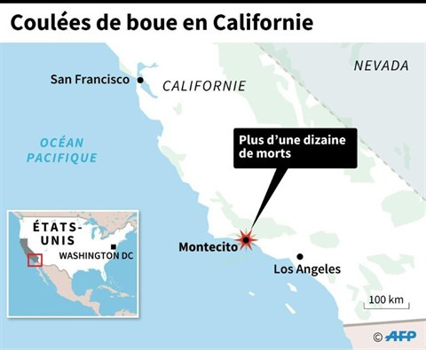 | Localisation de Montecito en Californie (États-Unis) où des coulées de boue survenues lors d'une forte tempête ont tué plus d'une dizaine de personnes |