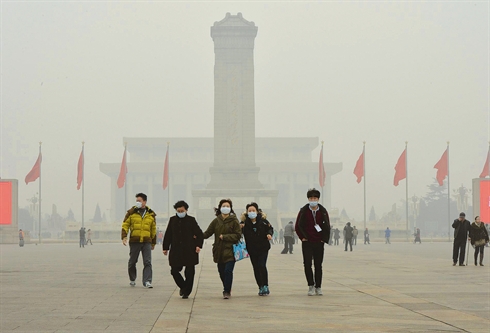 | Des Chinois portent des masques filtrants pour se protéger de la pollution, le 26 février à la place Tiananmen, à Pékin. |
