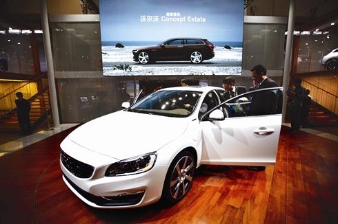 | Des visiteurs regardent l’intérieur d’une Volvo au salon de l’auto à Pékin, le 20 avril |