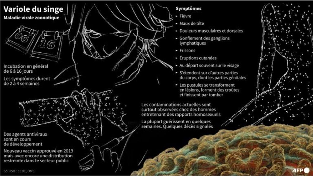 La variole du singe ("monkeypox" en anglais) se traduit d'abord par une forte fièvre et évolue rapidement en éruption cutanée. La maladie guérit d'habitude spontanément après deux à trois semaines, mais elle peut entraîner de graves complications, notamment des infections bactériennes. Selon le tableau de bord de l'OMS qui répertorie tous les cas confirmés, il y avait à la date du 7 septembre 54.709 cas et 18 décès enregistrés dans 125 pays dont 98% en Europe et en Amérique du Nord.