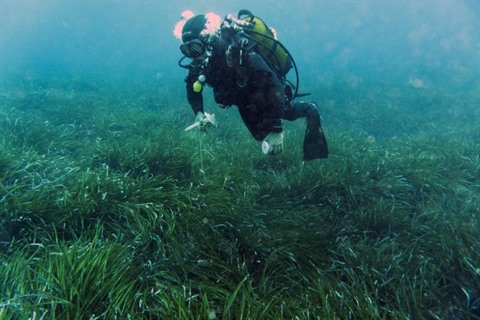 | Un plongeur nage au-dessus un herbier de posidonie en mai 2019 au large de Cannes. |