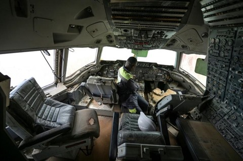 | Un employé d'Aziz Alibhai dans le cockpit d'une épave de DC-10, le 15 avril à Songon Dagbe, dans la région de Jacqueville, en Côte d'Ivoire. |