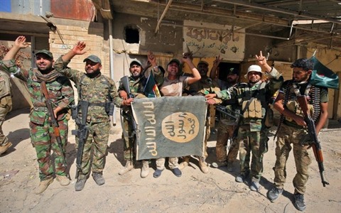 | Les unités paramilitaires du Hachd al-Chaabi lèvent les bras en signe de victoire et tiennent un drapeau du groupe État islamique lors de la bataille de Tal Afar, le 26 août. |