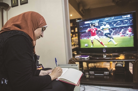 | L’analyste de football Manar Sarhan prend des notes lors du quart de finale de l’Euro 2016 opposant le Pays de Galles à la Belgique à son domicile dans la capitale égyptienne du Caire. |
