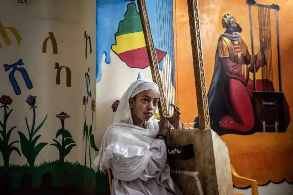 | Une élève apprend à jouer de la begena à l'école Eman Begena à Addis-Abeba, le 13 février en Éthiopie. |