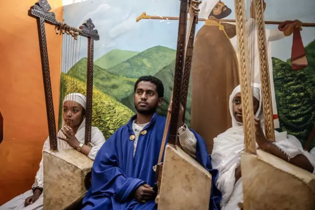 Les joueurs de begena portent un netela, un tissu blanc traditionnel, croisé sur la poitrine pour les hommes, et comme un voile pour les femmes.