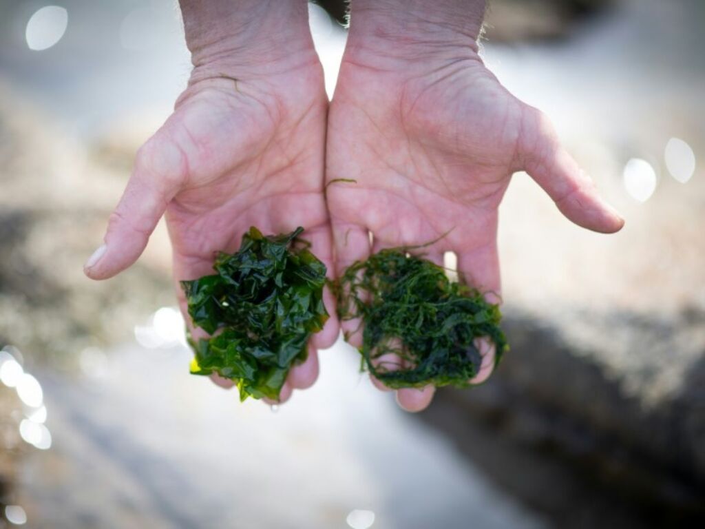 | De la laitue de mer (gauche) et de l’algue Ao-Nori, toutes deux comestibles, présentées par un fermier d’algues, Jean-Marie Pedron, et récoltées sur une plage du Croisic, en Bretagne. |