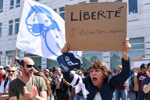 | Une femme tient une pancarte sur laquelle on peut lire "Liberté, j'écris ton nom" lors d'une manifestation contre les nouvelles mesures de sécurité contre le coronavirus, à Nantes, dans l'Ouest de la France, le 17 juillet 2021. |