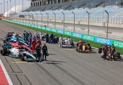 | Les monoplaces relookées de la F1 stationnent sur la grille avant les essais de pré-saison sur le circuit bahreïni de Sakhir, le 10 mars. |