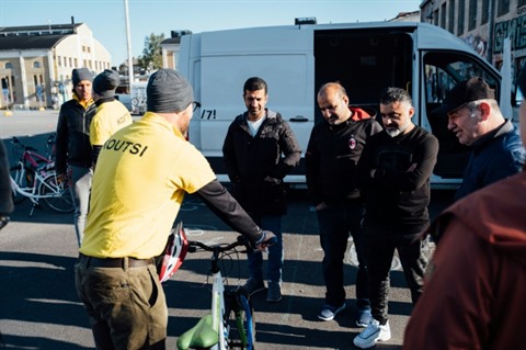 Par une matinée ensoleillée de septembre, un groupe de huit étudiants remise ses manuels de grammaire finnoise pour se rendre sur un parking du quartier de Suvilahti à Helsinki, où les attendent bicyclettes et casques.