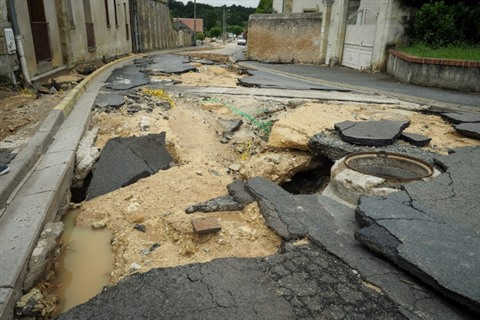 | Les pluies diluviennes ont endommagé la route à Vernou-sur-Brenne (Indre-et-Loire), le 11 juin. |